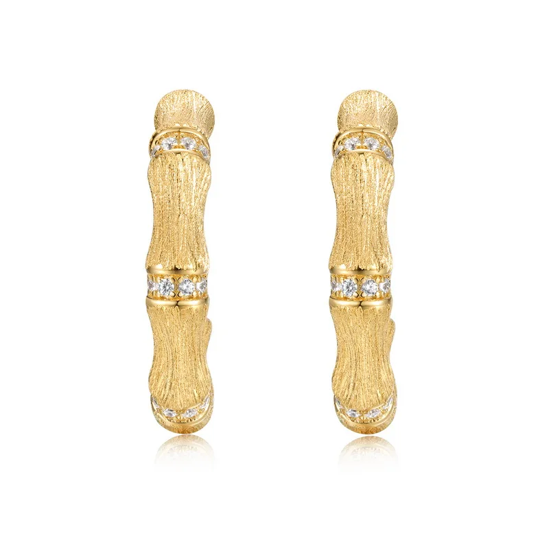 Elegant S925 Sterling Silver Brushed Bamboo 5A White CZ Pave Hoop Earrings for Women