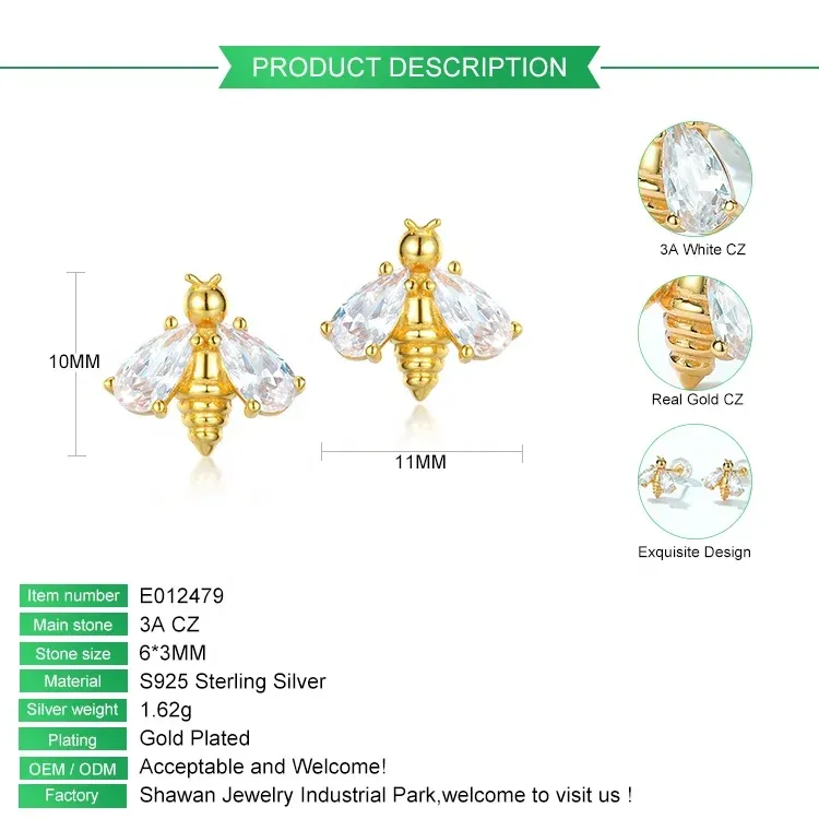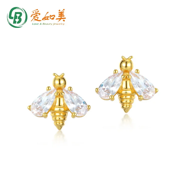 Factory 925 Sterling Silver Summer Jewelry Real Gold Plating Bumblebee Cute Bee CZ Earrings Studs for Women