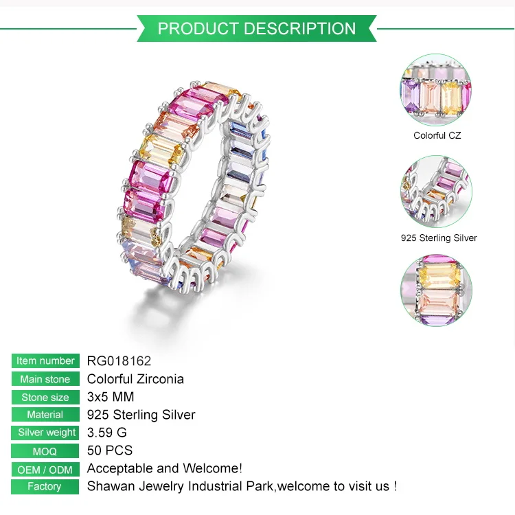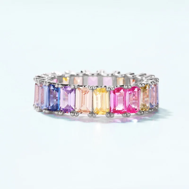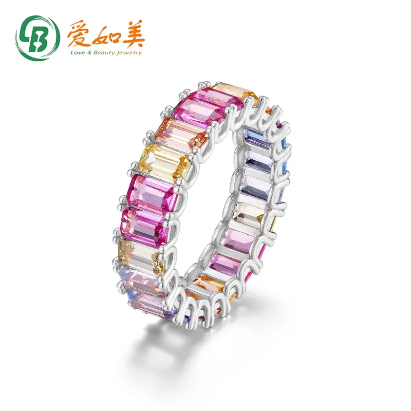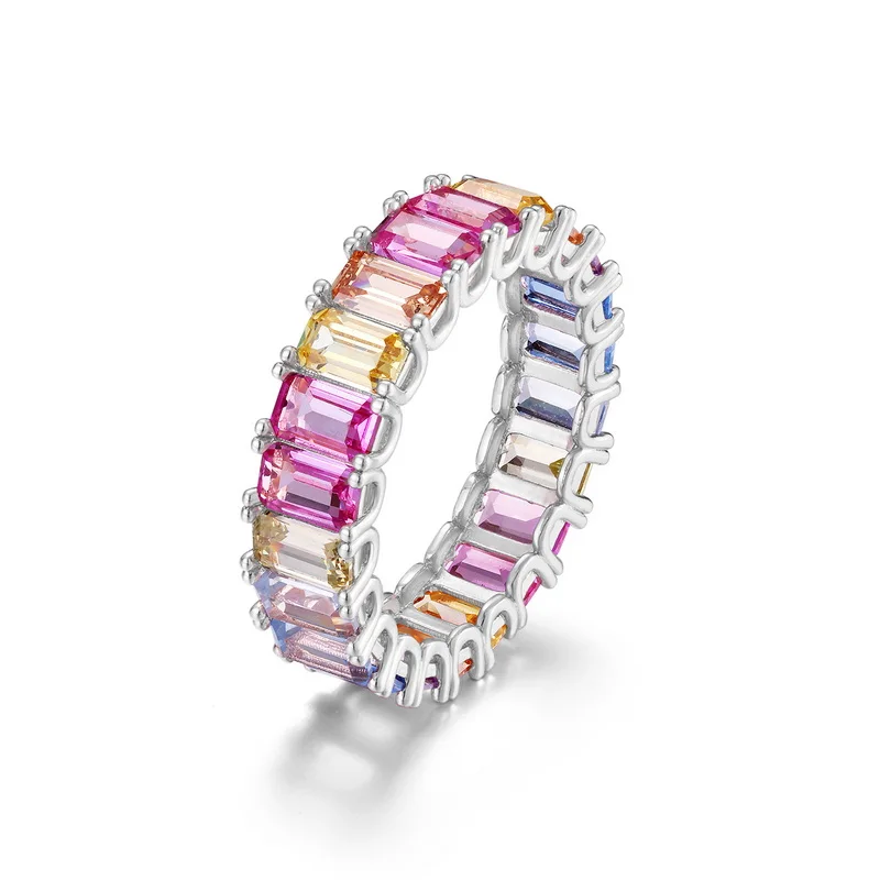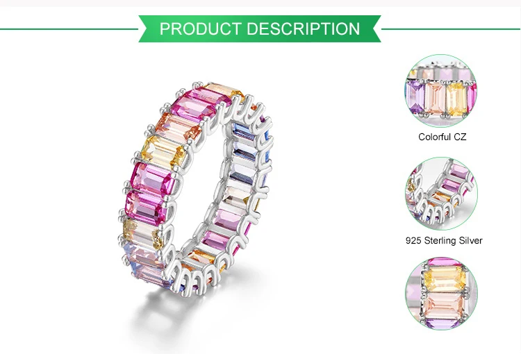Silver Jewelry 925 Baguette Band Engagement Rainbow Wedding Ring CZ Crystal Rings